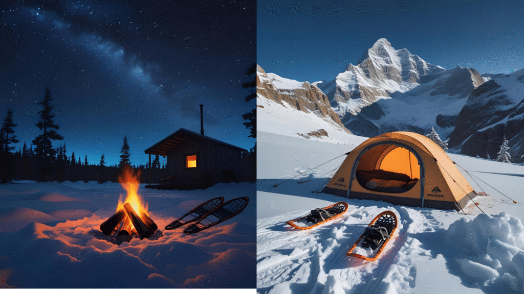 Una microaventura d’hivern: ruta amb raquetes fins a un refugi guardat o lliure, sopar i nit envoltats de neu. Opcionalment amb vivac o tenda d’hivern.